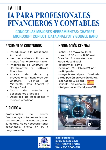 Al final el curso, estarás equipado no solo con conocimientos, sino con habilidades prácticas para aplicar ChatGPT en tu trabajo diario, preparándote para un futuro donde la IA será una herramienta esencial en el campo financiero y contable.